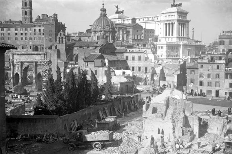 Ces travaux comprenaient la restauration et la mise en valeur des monuments antiques (Forum romain – ci-dessus une photo des travaux en 1932, Colisée, Mausolée d’Auguste) ainsi que le percement de grandes avenues monumentales. Mais cette mise en scène du passé entraîna la destruction massive des quartiers médiévaux et populaires.