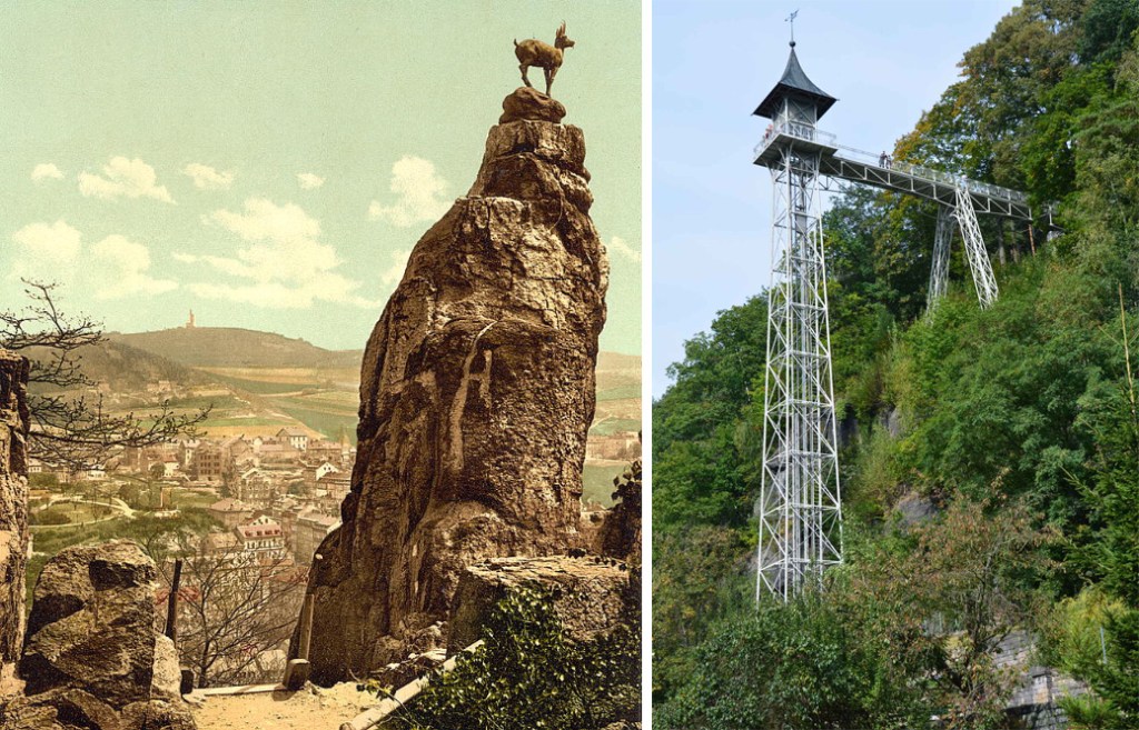 Aussi surprenant que cela puisse paraître, ce cerf existe bel et bien : il est érigé sur l’un des sommets autour de Karlsbad et immortalisé sur une carte postale conservée à la Library of Congress (et, depuis la sortie du film, sur d’innombrables images Instagram). Anderson combine ce monument avec un ascenseur pittoresque qui existe lui aussi, mais, à un autre endroit, dans la ville de Bad Schandau, en Allemagne, pour relier deux quartiers de la ville depuis 1904.