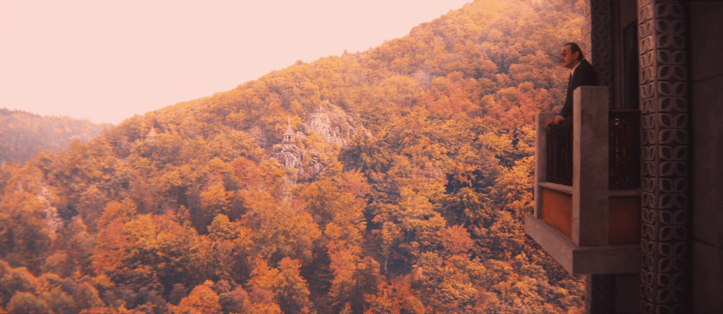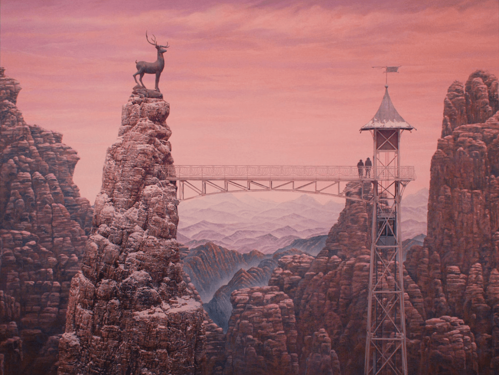 L’image inaugurale du film — la statue de cerf reliée à un ascenseur improbable — condense cette approche. Bien que fondée sur des éléments réels, la composition les assemble de manière irréaliste, presque onirique. Le kitsch revendiqué des couleurs, l’échelle volontairement faussée et la frontalité du cadrage produisent une image qui relève davantage de l’illustration que du paysage réaliste. Anderson transforme ainsi des références historiques en icônes graphiques.