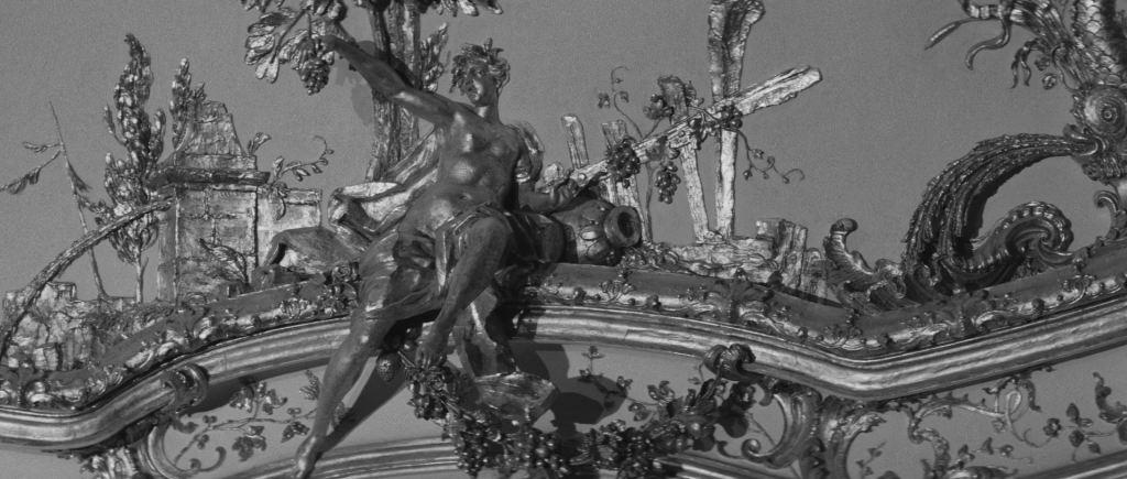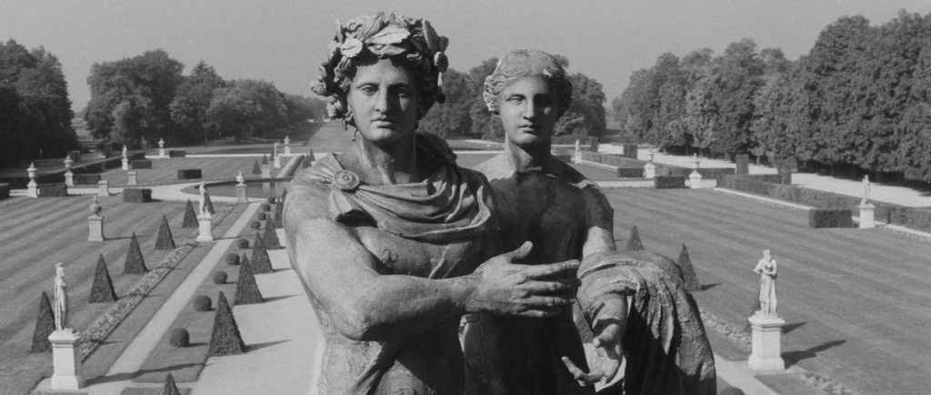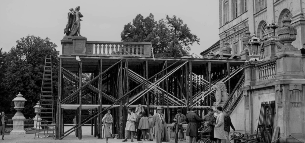 Un autre procédé visant à brouiller la perception de l’espace est la grande terrasse adossée tour à tour au château de Nymphenburg (ci-dessus) et celui de Schleißheim. Elle a été construite pour le film, précisément afin de permettre une vue plongeante sur le jardin géométrique et ses visiteurs fantomatiques aux ombres impossibles.