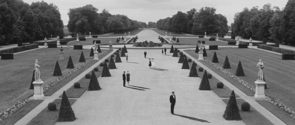 L’une des images les plus célèbres du film montre des personnages figés et isolés dans l’allée centrale du jardin de Schleißheim. Contrairement aux arbres, les figures humaines projettent de manière surréelle de longues ombres dramatiques — peintes en réalité directement sur le sol ! L’image résume la démarche de Resnais : un monde où le réel est constamment falsifié par des signes artificiels, visibles mais dissimulés à l’intérieur de la mise en scène.