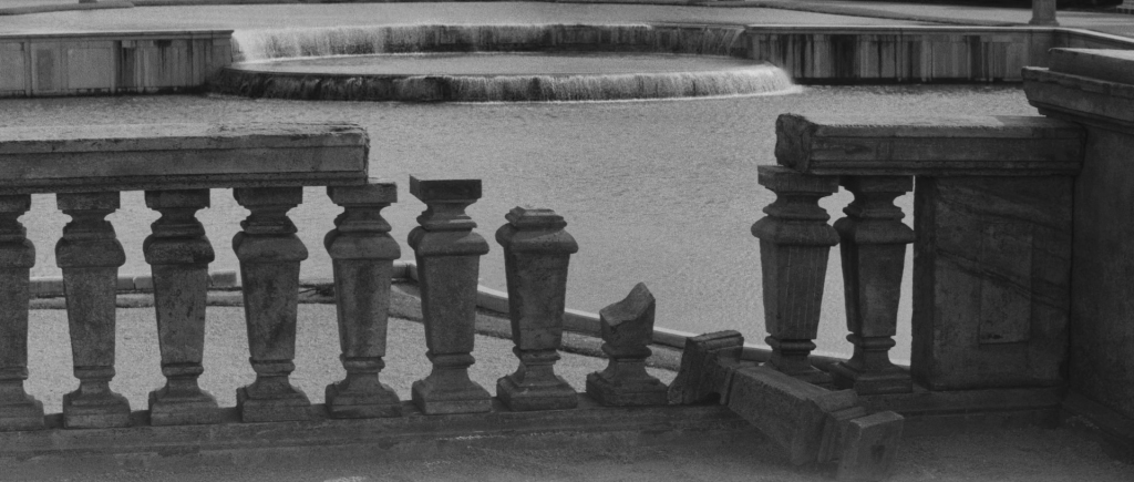 Cette rambarde, dont la massivité semblait garantir la solidité du lieu, se trouve à la fin du film brisée, comme après une chute suggérée mais non montrée. La blessure infligée à l’architecture matérialise alors la fracture interne du récit et l’instabilité fondamentale du dispositif spatial.