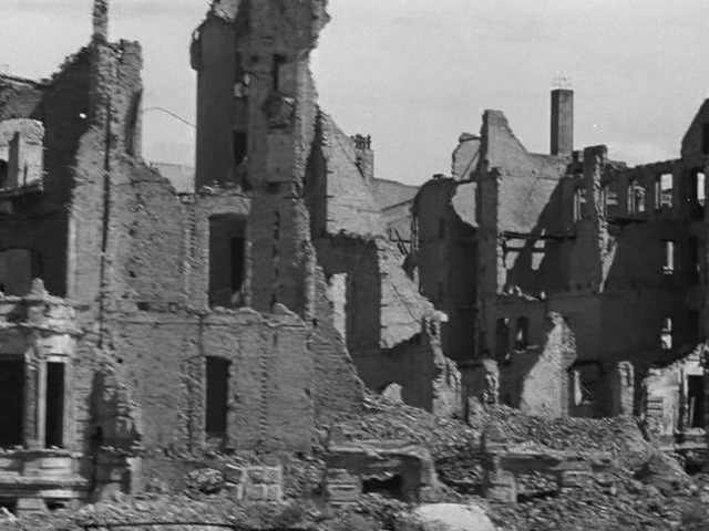 De manière véridique — et non sans une pointe de cynisme — le commentaire du film précise que certains bombardements ont épargné des bâtiments stratégiques bien ciblés, notamment les grandes églises, mais surtout la gare centrale et justement le complexe d’IG Farben, que les Alliés souhaitaient préserver pour l’après-guerre.