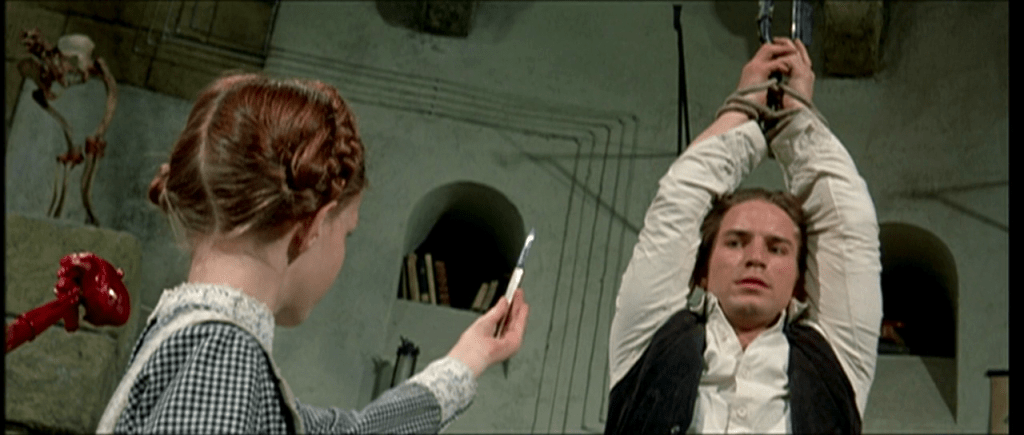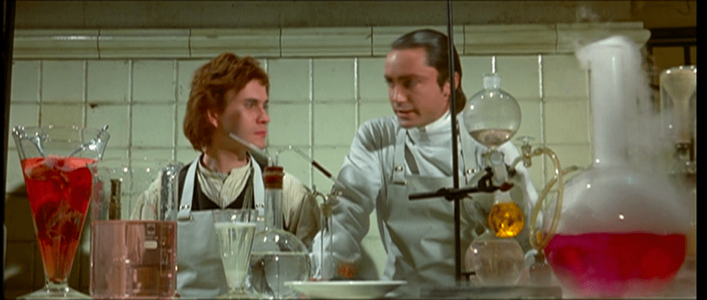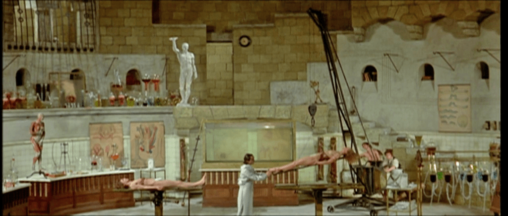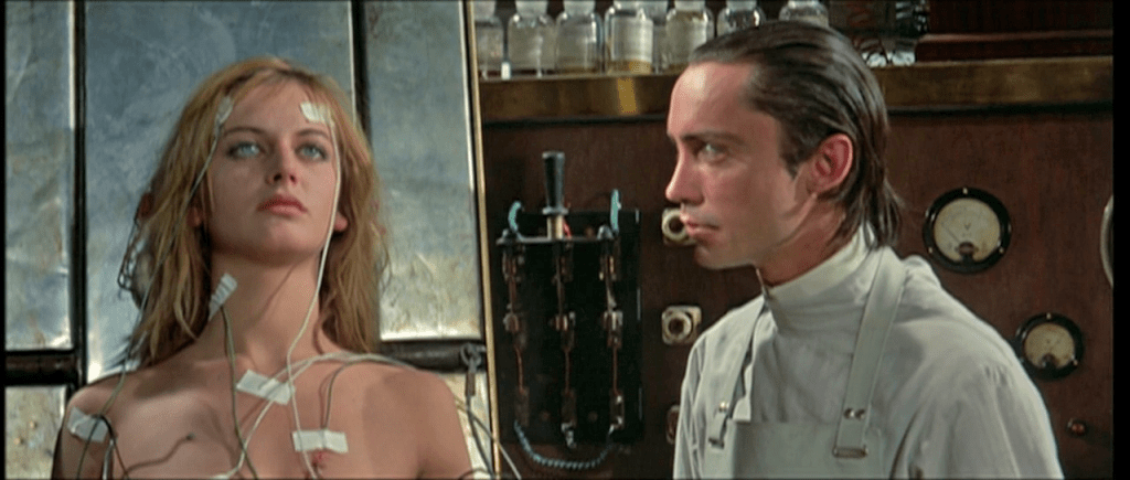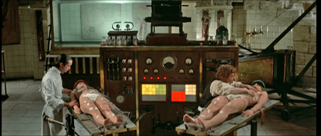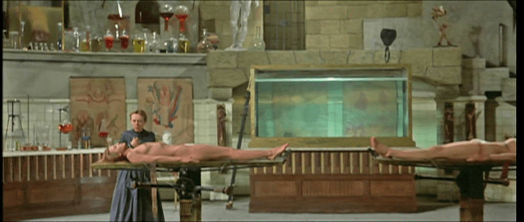 Le laboratoire est un lieu impressionnant, spacieux et lumineux (pourtant sans fenêtres !) afin que le baron puisse y créer aisément un nouvel Adam (Srdjan Zelenovic) et une nouvelle Ève (Dalila Di Lazzaro).